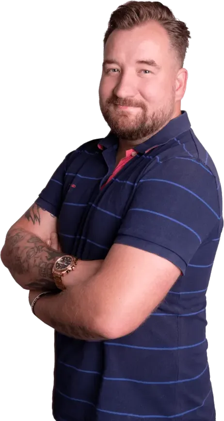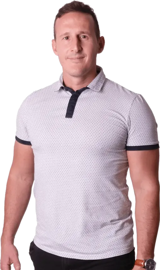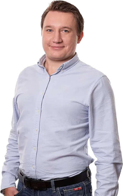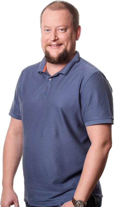 Portrét muže se světle hnědými vlasy a modrýma očima v tmavé polokošili.